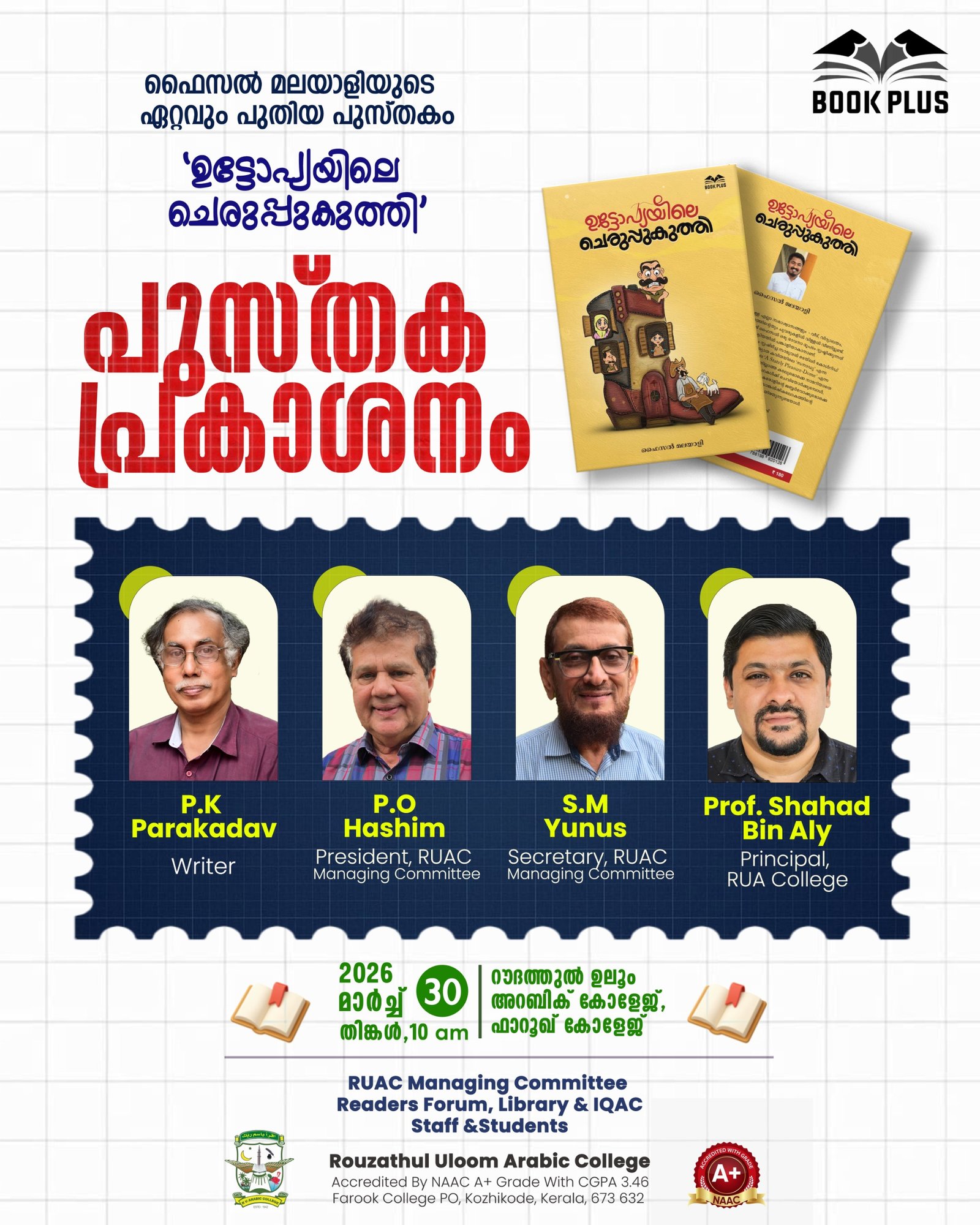 പുസ്തക പ്രകാശനം 2026 മാർച്ച്‌ 30 രാവിലെ 10മണിക്ക് റൗലത്തുൽ ഉലൂം അറബിക് കോളേജ്